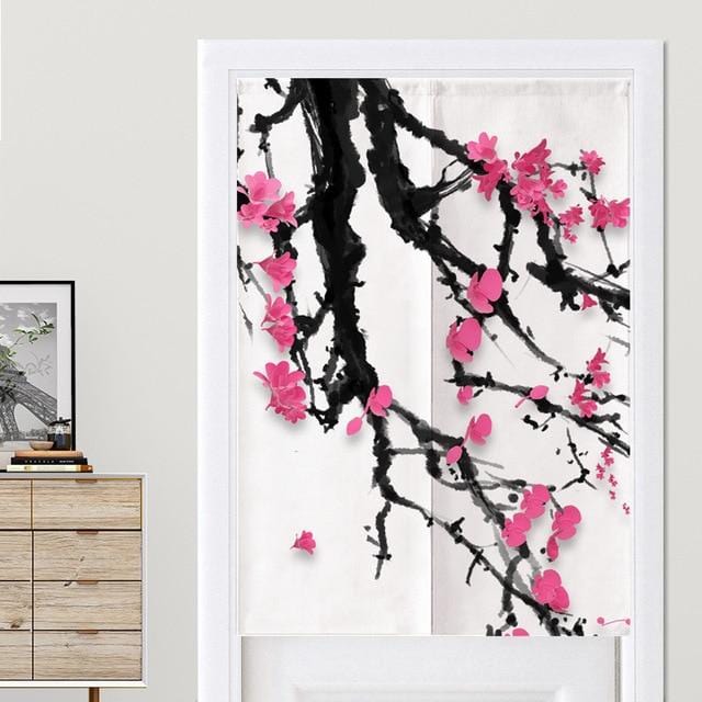 Cet arbre remarquable, qui produit les fleurs nationales de la Chine, est en réalité un prunier rose. En Chine, cet arbre qui fleurit dès l’hiver est considéré comme un symbole de la saison, ses branches tortueuses rappelant les fissures de la glace. Pour représenter sa beauté, les branches sont ici dessinées dans un style à l’encre de Chine, créant ainsi un contraste époustouflant sur un fond blanc immaculé, tel la neige hivernale. Sur ce fond poétique, des fleurs roses éclatent : les fleurs de prunier sont, en Chine, un symbole d’espoir. Ajoutez toute cette poésie et cette beauté à votre décoration intérieure grâce à ces rideaux cache-porte sublimes !