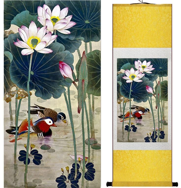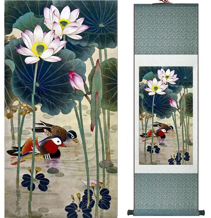 Ce magnifique tableau chinois représente le Canard Mandarin dans un paysage serein. Les fleurs de lotus, symboles de pureté, s’épanouissent au-dessus des têtes des canards. Selon la tradition chinoise et le Feng Shui, ces canards sont des symboles d’amour et de longévité dans le couple. Apportez une touche de pureté et d’amour éternel à votre intérieur avec cette superbe décoration murale !