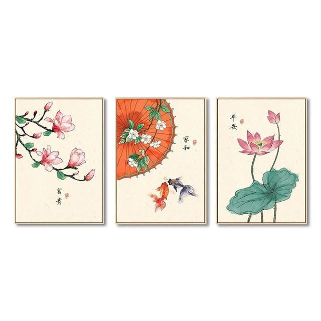 Achetez ces trois Tableaux Chinois individuellement ou en ensemble ! Avec un style Rétro qui ajoutera beaucoup de charme et de caractère à vos murs, chaque Tableau représente des couleurs vives de haute qualité pour égayer votre intérieur. Vous y trouverez des pivoines, des magnolias, des ombrelles et des carpes koï : de nombreux symboles de la Chine !