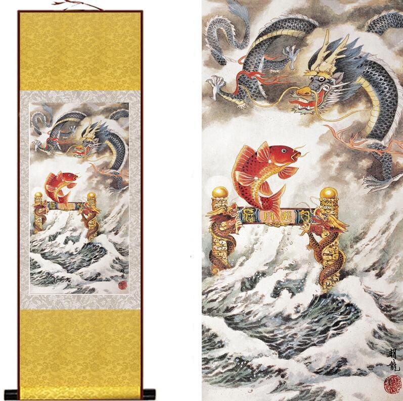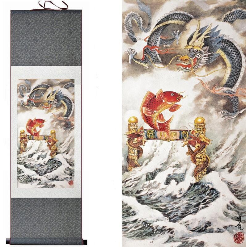 Ce magnifique tableau chinois représente une tempête et puise son esthétique dans une légende de la mythologie chinoise. En Chine, les carpes Koï sont considérées comme des poissons sacrés et on raconte que celles qui réussissent à remonter les courants tumultueux de leur rivière se transforment en majestueux dragons impériaux dotés de pouvoirs multiples et d’une sagesse infinie. Cette toile capture le moment où une carpe est en train de se métamorphoser en un dragon impérial chinois puissant et valeureux.