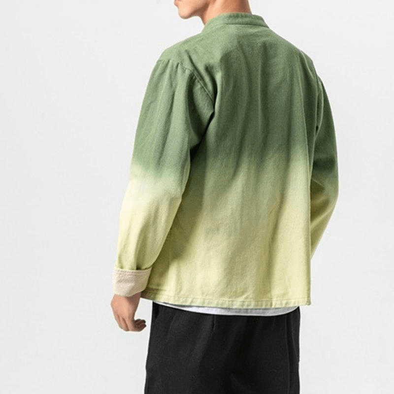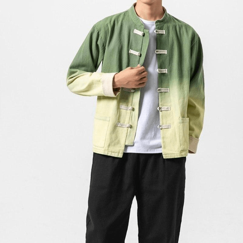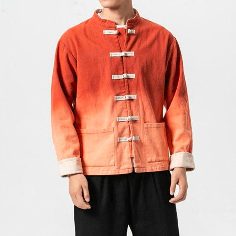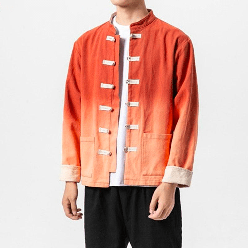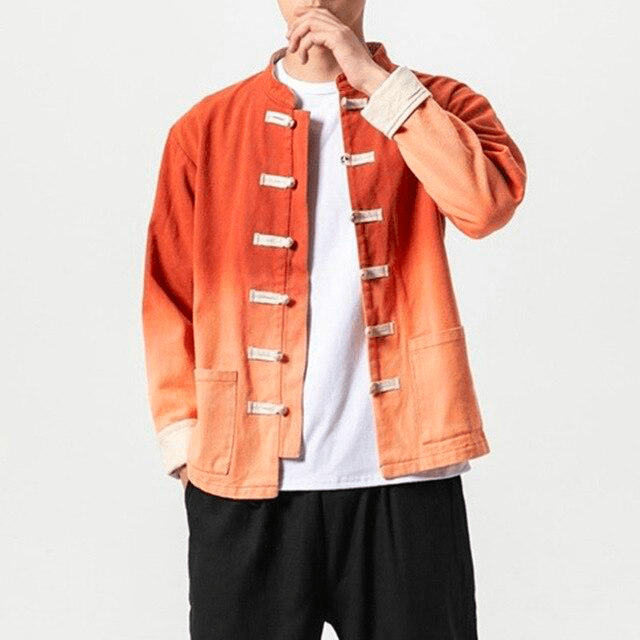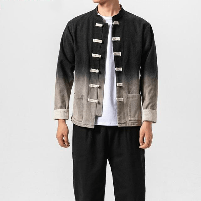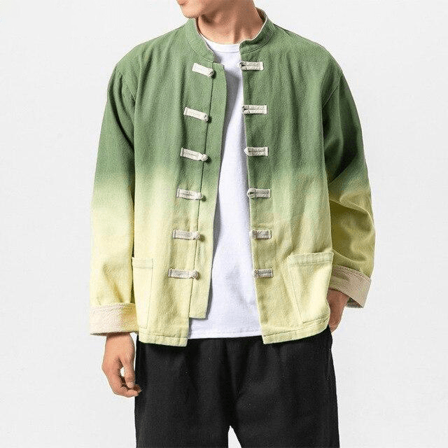 Cette Veste Chinoise pour Homme a une coupe traditionnelle chinoise, avec un col Mao, des manches à revers et des fermetures chinoises. Cependant, elle est très moderne grâce à son motif délavé, offrant un magnifique dégradé de couleurs. Son tissu de haute qualité en coton et en lin vous garantit un confort optimal.